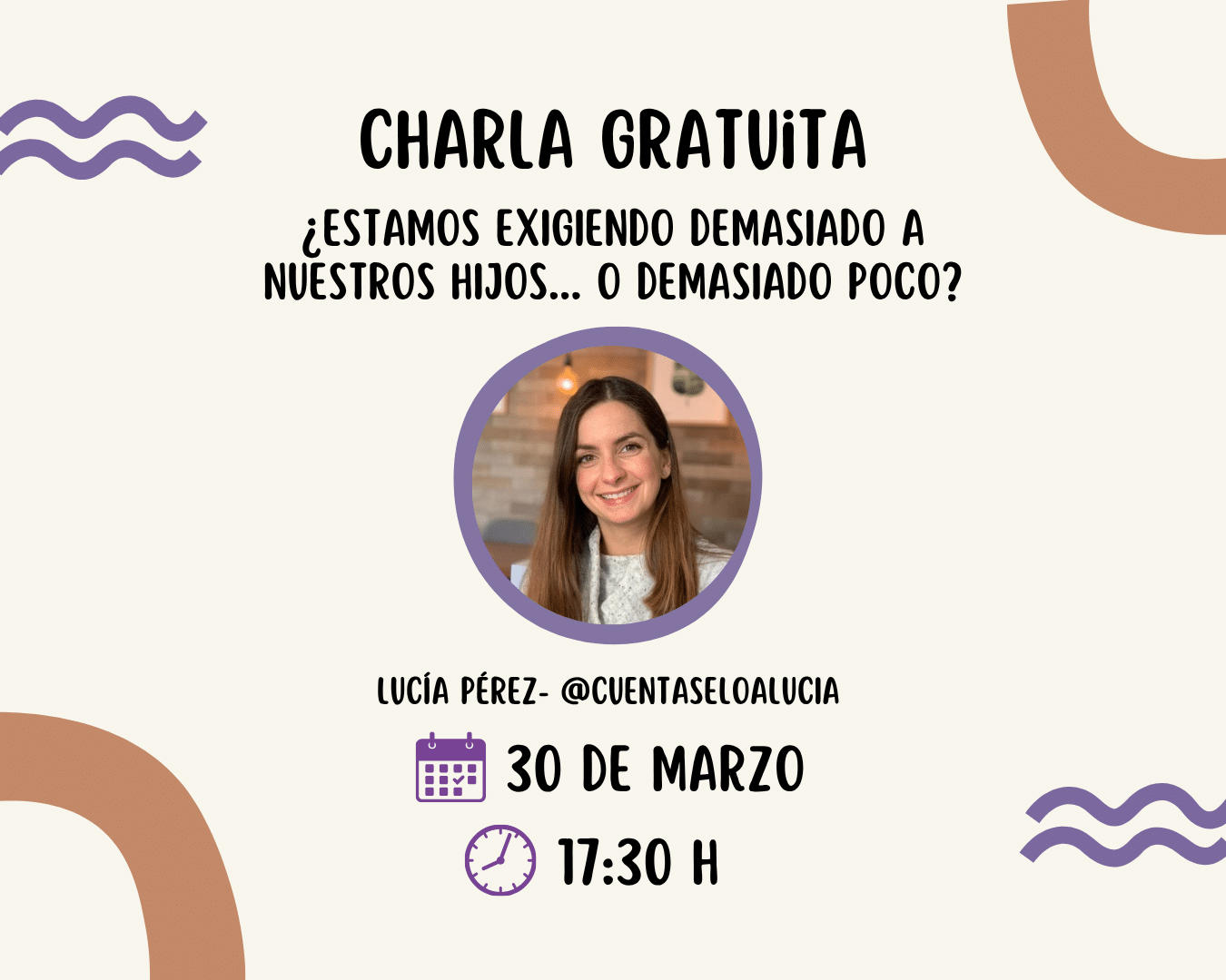 Para esta ocasión contaremos con la participación de Lucía Pérez, divulgadora y creadora de contenido especializada en educación y crianza, a la que siguen más de 22.000 familias en Instagram.